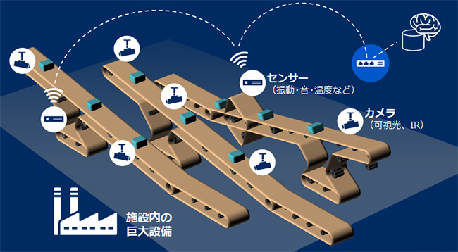 NECの工場の取り組みは、組み立て系の製造現場の例ですが、IoTの実践は大規模な設備を持つ工場でも着々と進んでいます。例えば、巨大な部材をベルトコンベアで流したり、パイプを使って液体を流すといった工程で、振動、音、映像などのデータを統合管理し、AIを使って異常検知をしたり、異常があった場合の要因分析を行っているケースがあります。