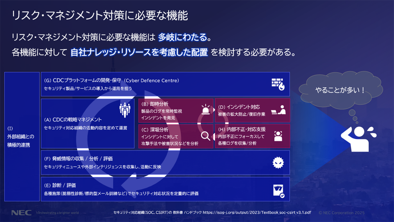 日本セキュリティオペレーション事業者協議会(ISOG-J)が、セキュリティ対応組織のハンドブック(注1)で、リスク・マネジメント対策に必要な機能について図のとおりの内容を公表しています。