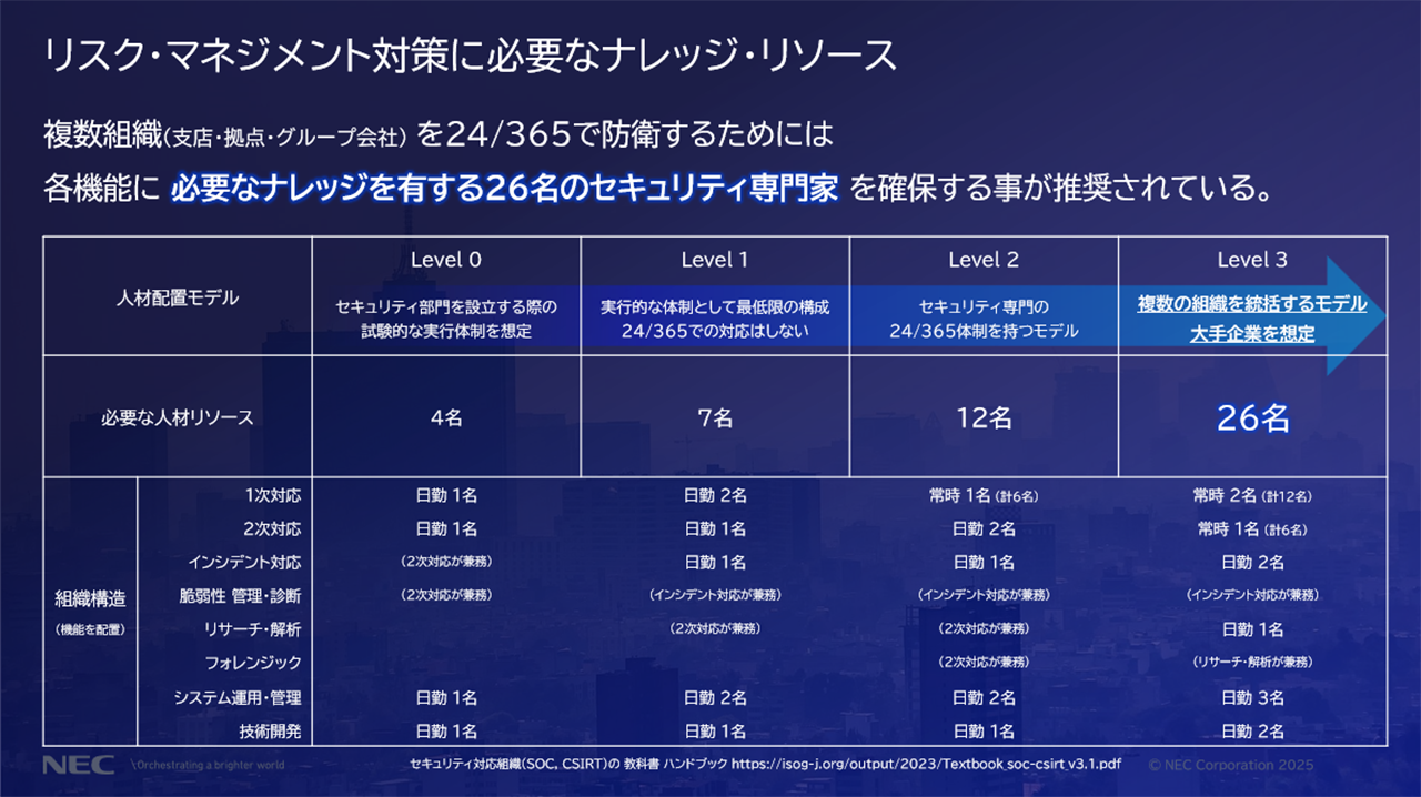<図2>人材配置モデル Level3に示すように複数の拠点を持つような大手企業がこうした機能を実現させるには、26名のセキュリティ専任者が必要とされています。
