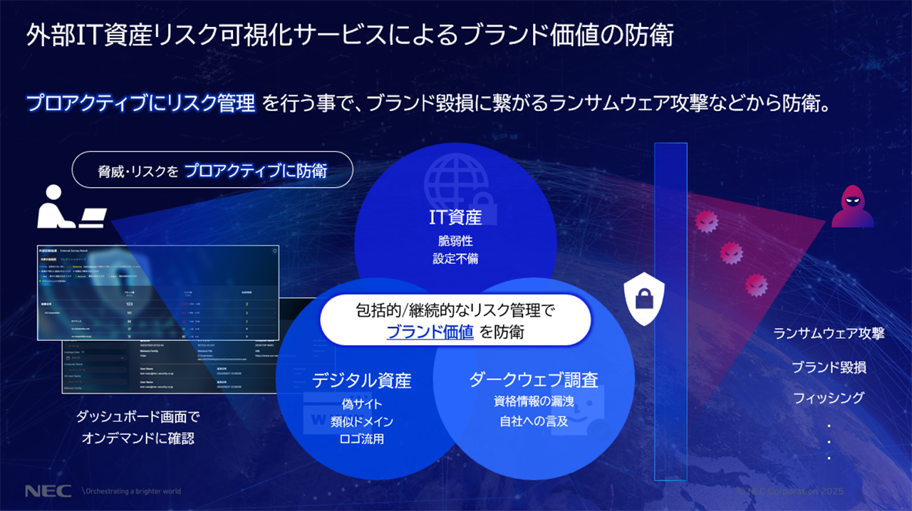 お客様より、グローバル拠点を含めると、本社で把握しきれないサイトやVPNなど管理が行き届かなく課題になるケースがあるとよく聞きます。また偽サイトによるブランド毀損のリスクや、ダークウェブに流出してしまったIDやパスワードによる正規のアカウントによる攻撃のリスクもあります。これらを見つけ出し、攻撃を未然に防ぐよう対処し、偽サイトをテイクダウンしブランドを守るなどプロアクティブに対策するソリューションです。