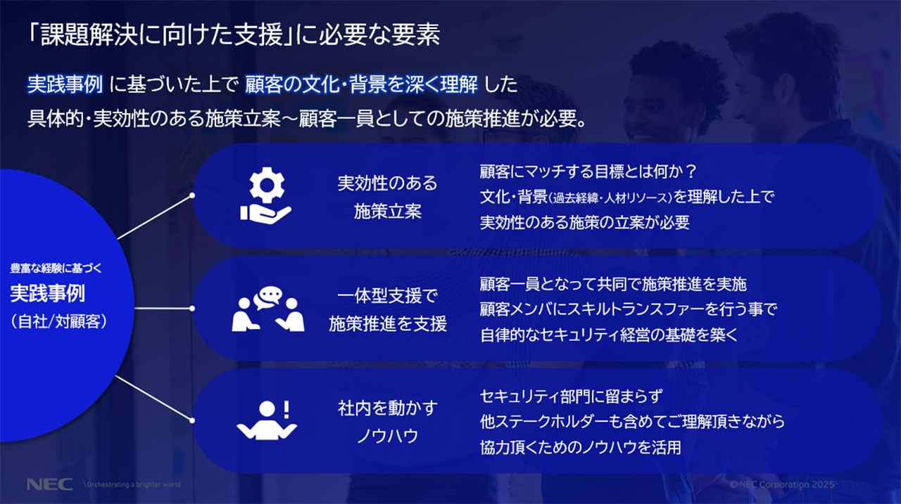 NECの自社内およびお客様に対する豊富な実践事例に基づき、実効性のある中長期の施策立案を策定するだけではなく、お客様の一員となっての施策の実行や運用も一体型でご支援し、社内を動かすノウハウを最適な形でご提供するものです。