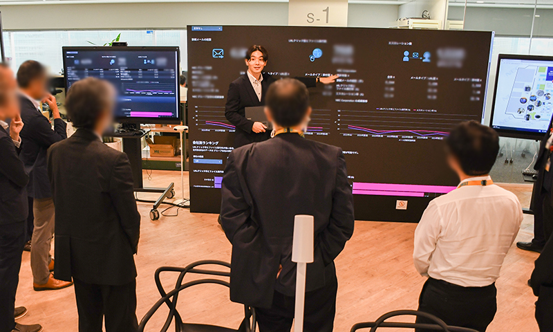 基調講演が終了後、展示コーナーに移動し、2つめの基調講演でもご紹介したNECのサイバーセキュリティダッシュボードの見学を行いました。サイバーセキュリティダッシュボードは、NEC本体のビジネスユニットやグループ企業、海外拠点のリスク対応状況や第三者レーティング、メール訓練結果、社内・社外の脅威情報などを可視化することで、各自の自律的なアクションを促し、セキュリティアウェアネスを醸成し、セキュリティ施策のパフォーマンスを向上するものです。社長から一般社員まで、このダッシュボードを参照します。