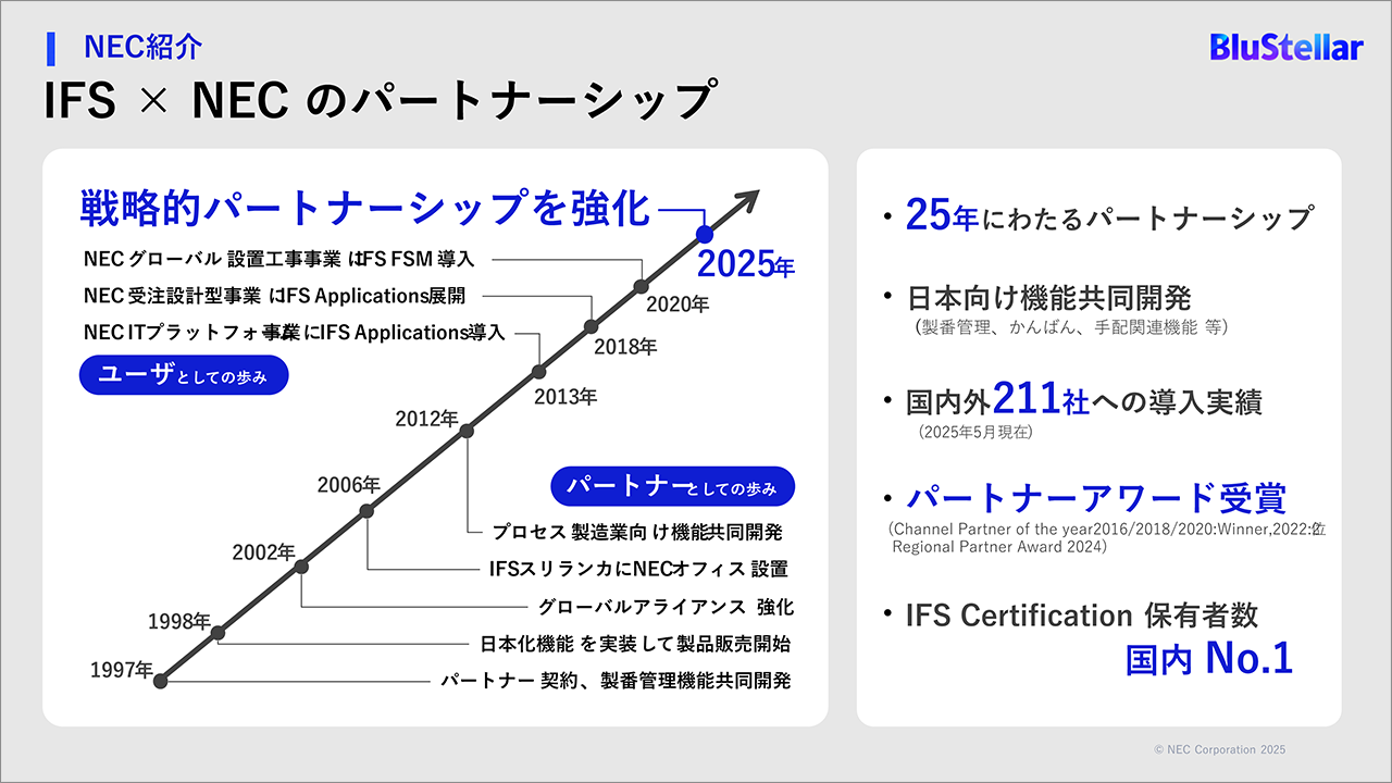 IFS社とNECのパートナーシップは長きにわたり、製番、かんばん等の日本固有機能をIFS社とNECで共同開発し、日本市場を開拓。また、2013年に製造業であるNEC自身がIFSを導入したことを機に事業拡大を加速させ、コンサルタント数は国内No1、引き続きIFS社との関係性を強化しつつ、共に成長しています。