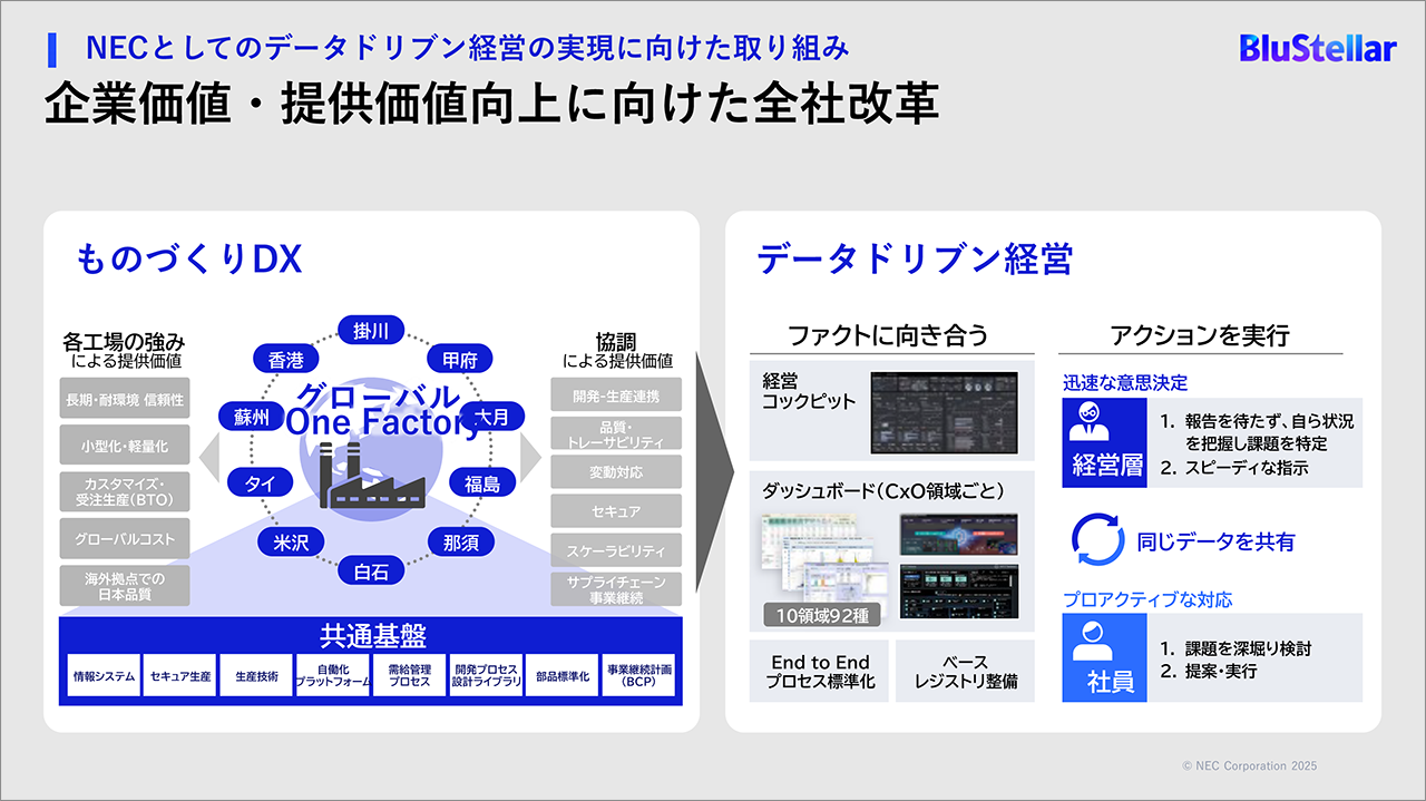 NEC自身の改革の取り組みや、NECが長年培ってきた、膨大な知見・実績をもとに、徹底的に「型化」されたものを提供するために、昨年度NECはDXのブランドとして「BluStellar」を発表しました。
