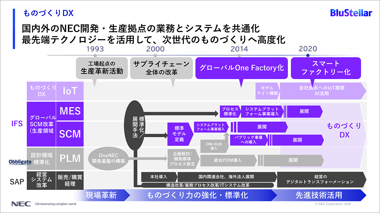 また、2つ目が「スマートファクトリー化」です。IoTやAIといった様々なテクノロジーを活用して、次世代のものづくりへ高度化させる取り組みを現在も推進しています。これを実現するためのデジタル基盤としてNECではIFSのソリューションを使っています。IFSをデジタル基盤として発展させ、NECの様々なソリューションや最先端テクノロジーと組み合わせることで、「スマートファクトリー化」を実現しています。