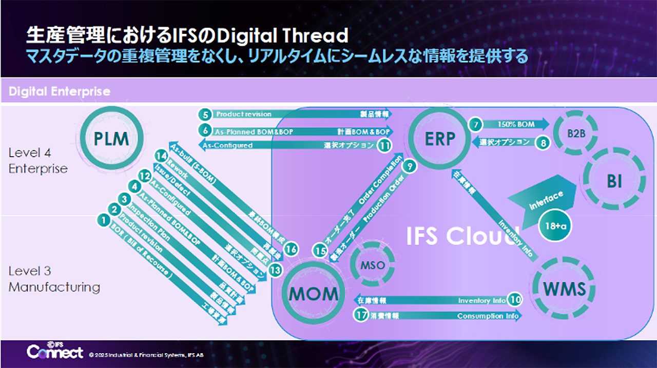 製造のブレイクアウトセッションでは、「製品サイクルの一元管理」として、IFSを活用することで様々なマスタデータの重複管理をなくし、リアルタイムにシームレスな情報の提供、迅速な判断、変化への適応が可能となるとし、MSO(Manufacturing Scheduling & Optimization)や再製造、循環型PLM(Closed Loop Lifecycle Management)についての詳細が語られました。