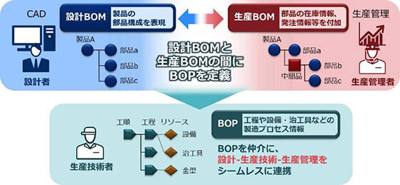 こうした能力を高めるには、アナログ的な手法での生産準備業務では限界であり、デジタル技術の活用が必要です。そのためにもモノづくりの基準情報である「BOM」と「BOP」の管理が重要であり、注目されています。詳しくは次のページを参照してください。