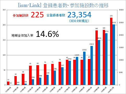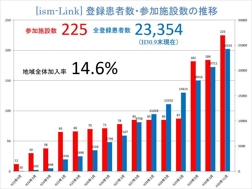 ism-Linkの2018年11月末現在の患者登録数は約2万4000人で、圏域人口の約15%まで達しています。参加施設数は同225施設となっており、病院は全10施設が参加し、2017年4-9月と2018年9月に飛躍的な伸びを見せました。「2017年には在宅医療・介護連携推進事業の整備が進展し、全13事業所の訪問看護ステーションと行政を含む介護関係事業所の52施設が参加しました。また、2018年秋には電子お薬手帳を利用した調剤情報共有が始まり。全63保険薬局のうち、59施設が一気に参加した結果です」(松江氏)とし、2つの事業開始が拡大のきっかけとなりました。