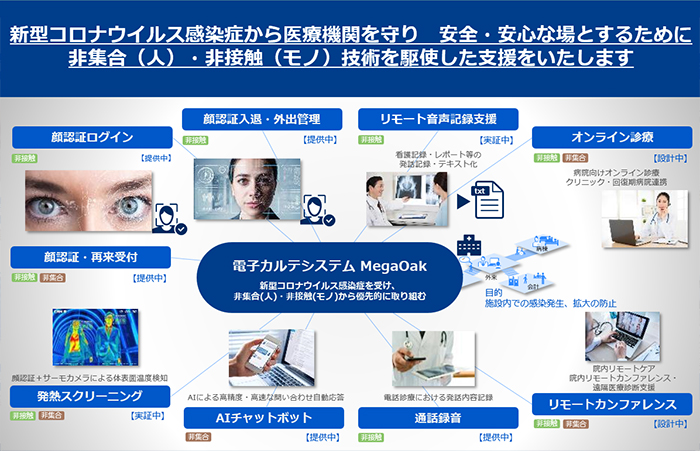 院内業務で使用する共用端末の指紋認証やタブレットから、院内でのクラスター(感染者集団)が発生した事例もあり、感染第二波を見据えた対策として、非集合(リモート)・非接触(タッチレス)技術を活用し、新たな働き方と安全・安心な医療環境の整備が必要となっています。