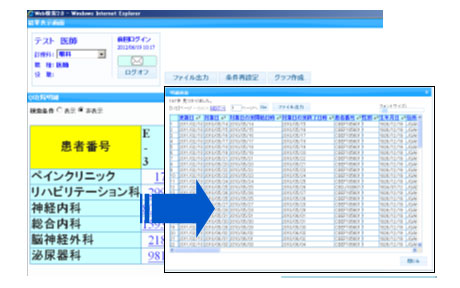 - 多様な検索機能(クロス集計、グラフ作成、患者集合検索、絞込み検索)を用いて多角的な検索を実現