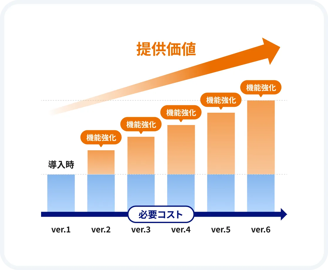 時代の変化やニーズに応じて定期的に無償バージョンアップを実施。サービス陳腐化のリスクがなく、 常に最新の機能をご利用いただけます。