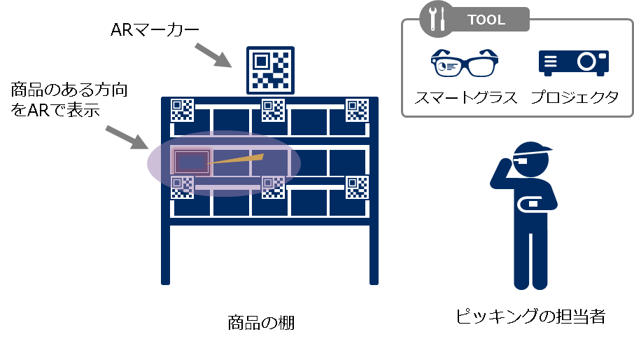 ARピッキングは、スマートグラスやプロジェクタを通して、商品のある場所まで担当者をガイドします。スマートデバイスのカメラが棚に設置されたARマーカーを捉えると、該当の商品のある方向をARで表示します。ARピッキングを活用すれば、商品の設置場所に詳しくない担当者でも正確なピッキングが可能です。