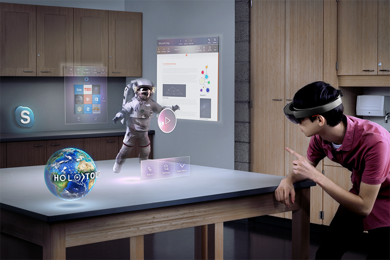 MRを実現するプロダクトのひとつが、Microsoft HoloLensです。Microsoft HoloLensを使えば、今いる場所に仮想的なものを表示できます。Microsoft HoloLensはマウスやキーボードといった入力機器を必要とせず、ジェスチャーや音声、視線を使って操作します。