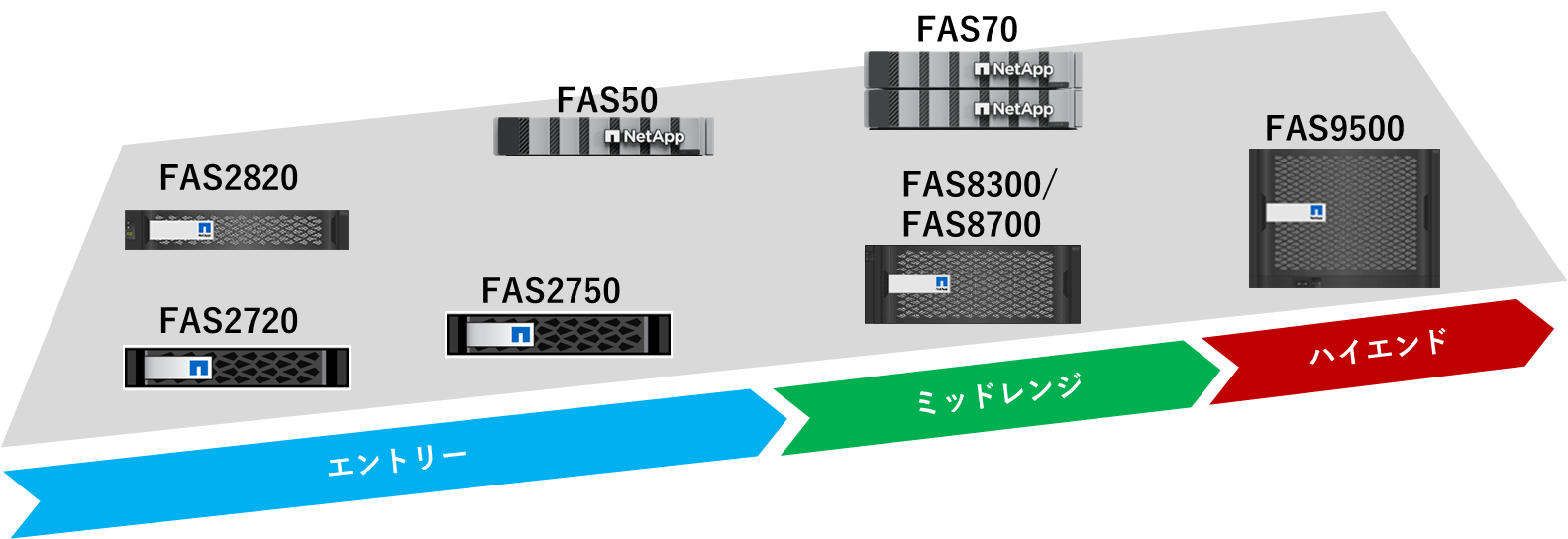 ネットアップ社のAFF/FASシリーズは、エントリー製品からハイエンド製品まで全て同じアーキテクチャ、同じストレージOS(ONTAP)を採用しています。そのためシステム導入後にアップグレードが必要となった際にも、データ移行の必要なく、ヘッドユニットを交換するだけで簡単にアップグレードが可能、またアップグレード後も管理方法は変わらないため管理者にとっても安心です。