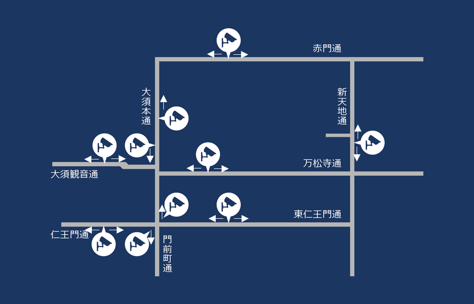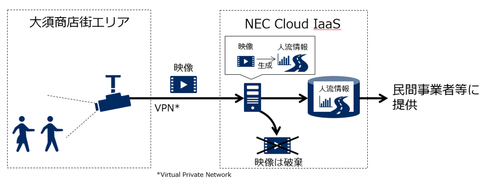 - カメラで撮影した映像は、来街者の移動方向、属性(性別、年代)および人数の推定データの生成後に破棄されるため、来街者個人を特定可能な情報は保存されません。