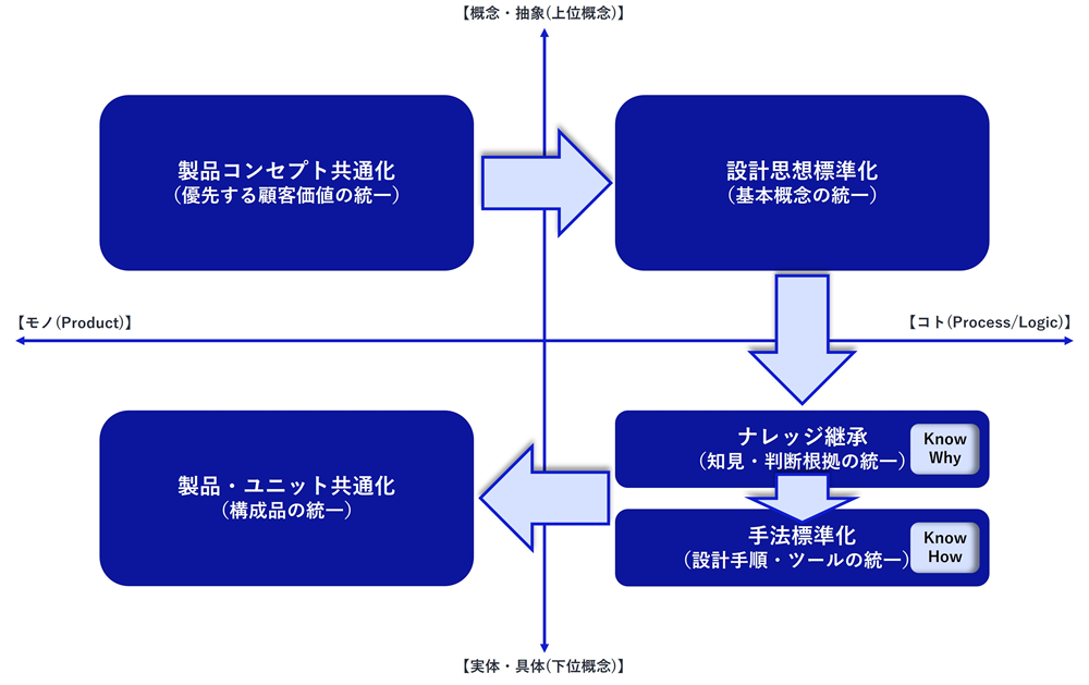 部品・ユニットは設計活動の結果であるため、これらの共通化が最後のステップとなります。また、上位の「コンセプト」「思想」「手法」が統一されていれば、結果として生まれる部品は自然と似通ってきます。上流がバラバラな状態で、無理やり「このボルトを使え」と部品だけ統一しようとすると、現場では設計思想に合わない部品を使わざるを得ない制約から、性能が出せないといったトラブルが発生するなどのリスクがあります。