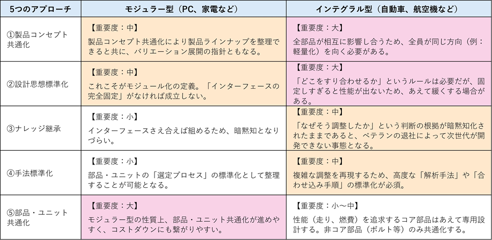 一般的に標準化はモジュラー型の方が進めやすい一方で、インテグラル型でも「設計思想標準化」や「手法標準化」によって設計効率を高めることは可能です。むしろ日本企業が得意とするインテグラル型設計では、暗黙知のナレッジ継承が競争力の源泉になり得ると考えられます。したがって、製品アーキテクチャによって標準化の重点領域は変化すると考えられます。細かくは下表に示す通りです。