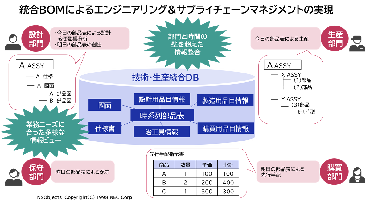 当時のNECでは、この「統合 BOM」に、加工工程(現在でいうBOP)や、金型・治具(現在でいうBOR /BOA)も含めるべき、というコンセプトを発信していました。