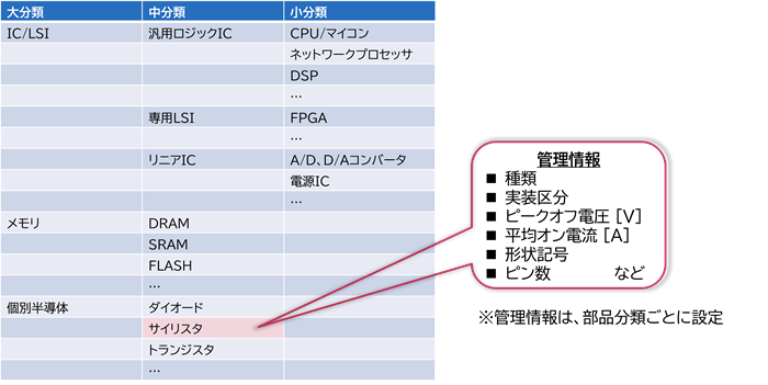 サンプルとして、エレキ部品の部品分類や管理属性情報例を挙げておきます。