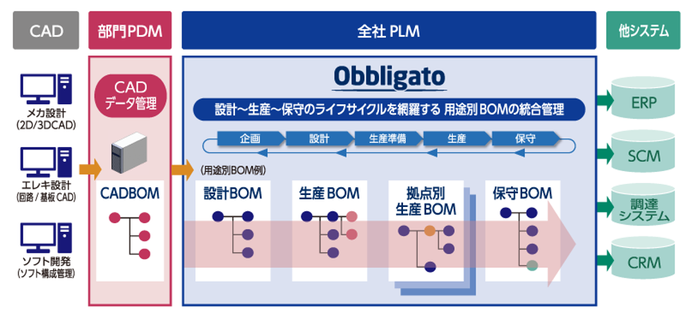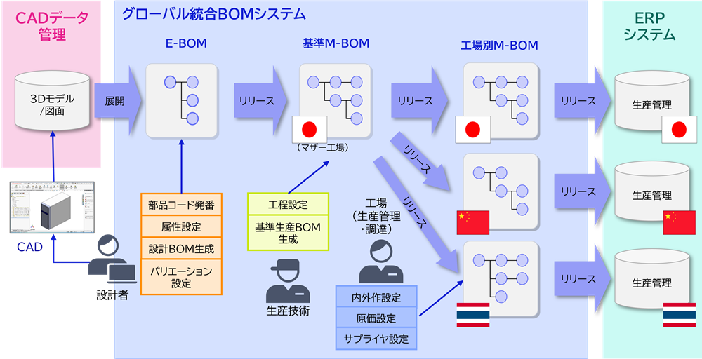このイメージ例では、「CADデータ管理」と「グローバル統合BOMシステム」は、エンジニアリングチェーンをカバーし、「ERPシステム」は、サプライチェーンをカバーしています。