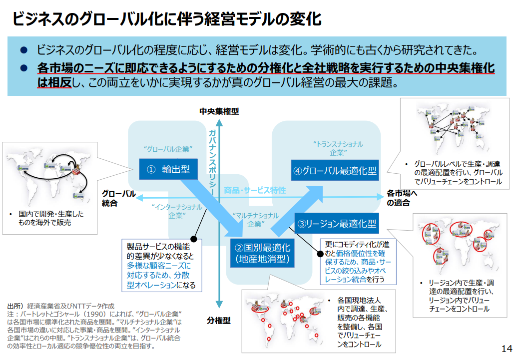 においても、このモデルはリファレンスされており、トランスナショナル型企業を「グローバル最適化型」と位置付けている。