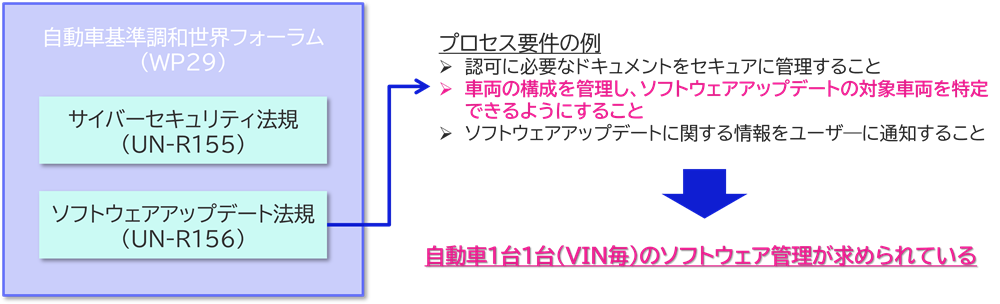 自動車1台1台はVIN(Vehicle Identification Number)と呼ばれる車両識別番号が割り当てられており、これらに対応する形で、ソフトウェアの状態を管理する必要性を求められています。