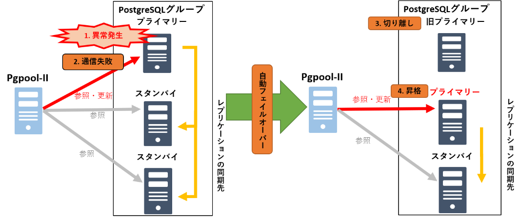 自動フェイルオーバー機能は、Pgpool-IIがプライマリーサーバーで異常を検知した際に、自動的に障害サーバーを切り離して、残りのサーバーで処理を継続させる機能です。