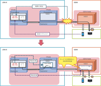 相互接続された日米間のスライスにて、NTTが中心となり端末やネットワークの状況に応じて映像の圧縮やマルチキャスト機能を仮想ネットワーク上に自動配備する次世代映像配信技術の実証実験を行いました。これは映像視聴端末の増加に応じて自動的にマルチキャスト機能をネットワークに配備したり、トラフィックが混んでいる状況に応じて自動的に映像圧縮機能をネットワークに配備することにより、映像配信サーバやネットワークの負荷を減らすとともに、サービスの中断を最小限にした映像配信サービスを可能とします。今回はJGN-Xにある仮想化ノードと米国ProtoGENIテストベッド内のノードそれぞれに映像圧縮機能とマルチキャスト機能を自動配備し、端末やトラフィックの状況に応じて映像圧縮やマルチキャスト機能が自動的にON/OFFされることを確認しています。