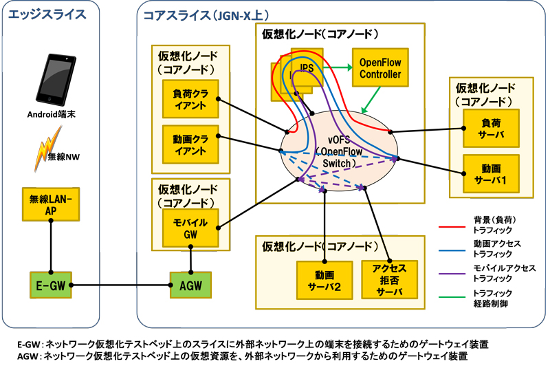 ネットワークのプログラマビリティの検証のために、JGN-X上の仮想化テストベッドにてスライスを作成し、そのスライス内で1Gbpsを超える通信トラフィック環境において、クライアントからの動画ストリーミングアクセスに対する、ソフトウェアベースIPSと仮想OpenFlowスイッチvOFSによる経路制御の実証実験を行ないました。