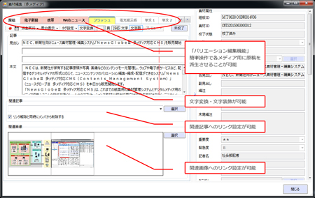 コンテンツを配信するメディアのバリエーションに応じて、見出し本文を加工できる「バリエーション編集機能」や、電子版など、デジタルニュースでは不可欠な関連写真や関連記事へのリンクを設定できる「リンク機能」を搭載。また、同じジャンルやトピックごとにコンテンツをまとめる「編成機能」も搭載。これらにより、コンテンツを多次元に構成し、配信・掲載することが可能となり、読者を効率的にナビゲーションできるコンテンツサービスを実現。