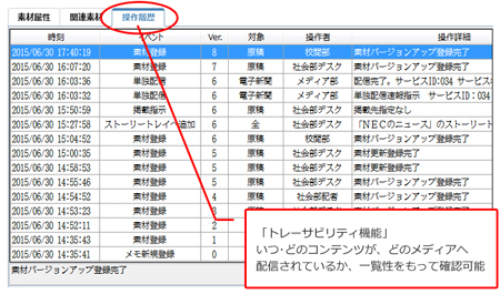 いつ・誰が・どのメディアに対してコンテンツ編集・配信したのかを、時系列に把握できる「トレーサビリティ機能」を搭載。コンテンツの内容に変更が生じた場合でも、どのメディア・サービスに影響があるかを一目で確認可能なため、コンテンツのメンテナンスなど、抜け漏れのない、早急な対応を実現。