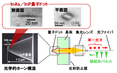 図2 量子ドットを含む光学的ホーン構造の電子顕微鏡写真と、単一光子発生の模式図