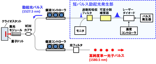 仮に厳密な単一光子源を量子暗号システムに組み込むことができれば、1パルスあたり1個の光子しか発生しないため、本来の簡易な構成で量子力学によって証明可能な高い安全性が得られます。しかしながら、量子ドット単一光子源を組み込んだ従来の量子暗号システムでは、単一光子の発生段階で余計な光子が混じることにより生じる単一光子源の高い複数光子発生率と、半導体検出器で光子を検出する際の高い雑音という二つの影響を受け、長距離伝送に有利な1.5μm波長帯においても安全鍵伝送可能距離は50kmにとどまっておりました。このため単一光子源を用いた実用距離の量子暗号鍵伝送システムを実現するには、光源側とシステム側双方の性能を改善することが課題となっていました。
