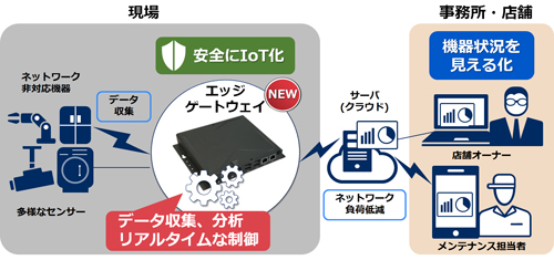 「エッジゲートウェイ」は、通信ネットワークに接続できない機器や各種センサーなどと接続できる、多種多様なインターフェースを装備しているため、デバイスのデータ収集が可能で、クラウドと連携することにより、新たなIoTサービスが創出できます。また、仕様の異なる多くのデバイスデータを分散処理することにより、機器のリアルタイムな制御や、クラウド連携時におけるネットワーク負荷低減が可能です。さらに、不正なデバイス接続やウィルスなどによる不正な通信を防止する機能を搭載し、現場機器の安全なクラウド連携を実現します。