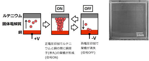 図1:(左)「NanoBridge」技術の動作原理 (右)NB-FPGAのチップ写真
