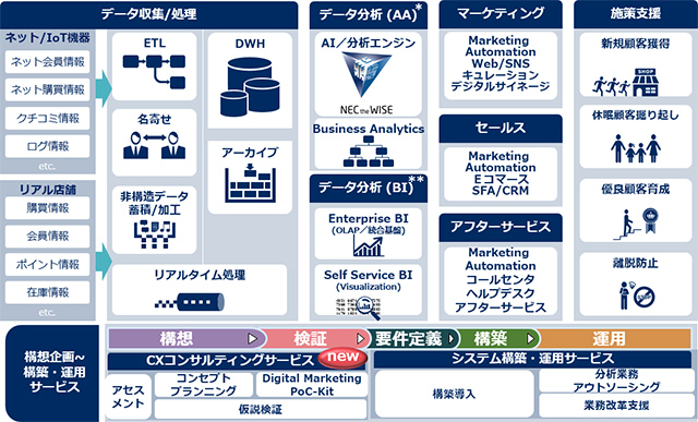 NECは、最先端AI技術群"NEC the WISE"(注1)やIoTなどの先進ICTを活用し、カスタマーエクスペリエンス(Customer Experience:顧客経験価値、以下 CX)の理解を通して、企業とお客様との絆の強化を支援するソリューションを体系化し「NEC Customer Experience Solutions」として確立しました。