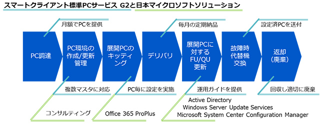今回、日本マイクロソフトの協力のもと、Windows 10におけるOS環境設定や導入展開手法等、運用において必要性が高く専門的な知識を必要とする工程を両社共同で選定し、汎用的な運用パターンとして提供することで、お客様それぞれの環境に適したPC運用サービスを実現しました。