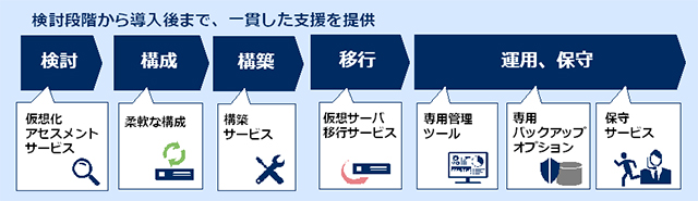 なお、関連ソリューションとして、お客様のサーバ環境情報に基づいた仮想化基盤提案を無償で行う「仮想化アセスメントサービス」や異なる仮想化基盤/ハイパーバイザ/仮想ストレージ間に対応した、業務無停止での仮想マシンの移行を実現する「Zerto仮想サーバ移行サービス」を提供します。お客様のシステム環境から、「NEC Hyper Converged System」への安全な移行に貢献します。