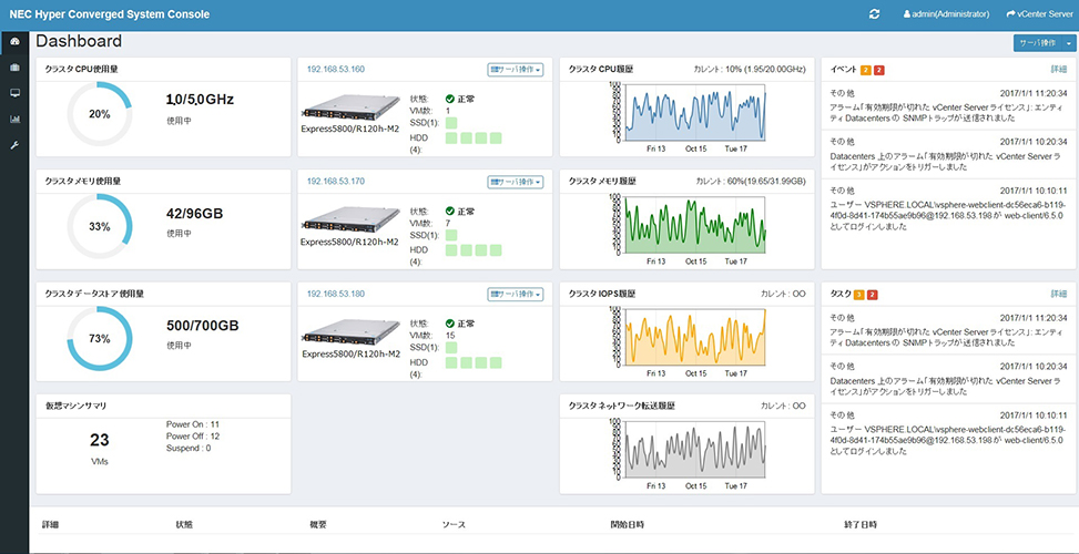 - 「NEC Hyper Converged System Console」:専用ダッシュボード上で、仮想化基盤、仮想ストレージ、仮想マシンの全ての状態を簡単に管理するだけでなく、起動、停止など仮想マシンの操作も可能です。また、システム全体を安全かつワンクリックで停止できる機能を提供し、メンテナンス作業の効率化に貢献します。更に、「WebSAM SigmaSystemCenter」(注7)を始めとした他の運用管理ソフトウェアや他のオプションと連携し、より進んだプラットフォーム管理機能を提供予定です。