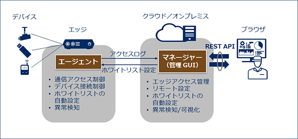 本製品は、IP(インターネットプロトコル)通信に加え、従来のICTシステム向けセキュリティ対策の適用対象外であるデバイス特有の非IP通信による接続方式(USB、Bluetooth Low Energyなど)も対象に、エッジやデバイスにおける接続/通信の状況を見える化し、そのアクセス制御を可能にします。許可するIP通信と非IP通信の接続デバイスを登録するホワイトリストを自動的に作成できるほか、分散配置されているエッジやデバイスの接続/通信の状況をリモートから集中的に監視できます。これにより、IoTシステムのセキュリティ管理や運用を容易化・省力化できます。