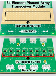 この新しい回路方式を用いたフェーズドアレイ無線機を、最小配線半ピッチ65nm(ナノメートル)のシリコンCMOSプロセスで製作した。この無線機では、16平方mmの小面積に、水平偏波用に4系統分、垂直偏波用に4系統分のトランシーバを搭載した(図2)。集積回路チップはWLCSP(Wafer Level Chip Size Package)技術によりパッケージングした。プリント基板の表面にはアレイアンテナを設け、裏面に集積回路チップを実装した。個々のアンテナ素子には、それぞれ水平・垂直の2偏波分の信号線が接続されている。プリント基板全体では、合計64個のアンテナ素子と、16個の集積回路チップを実装した(図3)。