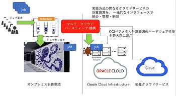 今回、大阪大学、日本オラクル、NEC、は、この問題に対処する手段としてオンプレミス環境※5のOCTOPUSとOCIを連動させることにより、OCTOPUSの提供するハードウェア性能と同等以上の性能を有するベアメタル計算資源を、OCTOPUSから利用可能となるクラウドバースティング技術の実現に成功しました。今回、他クラウドサービス事業者の仮想計算機資源をターゲットとしたクラウドバースティング機能を拡張し、異なる実装方式の複数の民間クラウドサービス上の計算資源を、その差違を意識することなく同一のインタフェースで統合・制御・管理できるマルチクラウドバースティング機構をジョブスケジューラNEC NQSII※3を基盤技術として開発しました。OCIの提供するベアメタル計算資源が利用可能になったことにより、将来的に低遅延のRDMA環境を備えた高性能コンピューティング(HPC)といった高度な計算要求をもつ利用者にも対応可能となり、他者のクラウド資源とOCIを連動させるマルチクラウドバースティングにより、大阪大学のスーパーコンピュータOCTOPUSはより多様かつ高度な計算要求・ニーズを収容可能となることが期待されています。