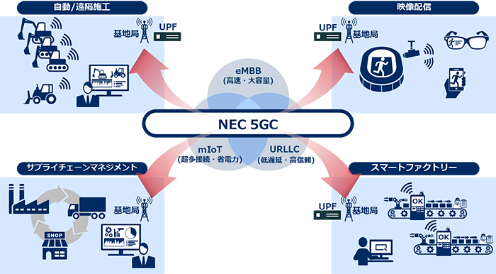 本5GC及び小型ユーザデータ処理装置「UPF mini(注1)」の提供により、NECはNTTドコモのSA方式による更なる5Gの展開に貢献し、5Gの特長とされているeMBB(高速・大容量)、mMTC(同時多接続)、URLLC(低遅延、高信頼)を実現して、5G時代に求められる多種多様なネットワークのニーズに対応します。