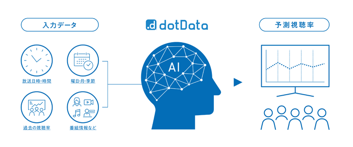一方、昨今の視聴者のテレビ視聴傾向の急速な変化を鑑み、過去の視聴率傾向だけでは録画視聴も含めた視聴率を事前に予測することが難しい中、今回新たにNECが提供するAIソフトウェア「dotData」と「データ管理基盤アジャイル構築サービス」(注3)を活用した新たな予測モデルを搭載いたしました。これによって、曜日、放送時間・時間帯、番組ジャンル、季節性、その他さまざまな要素を加味し、従来よりも高度な視聴率予測が可能となりました。