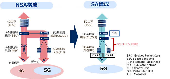 今回のマルチベンダー接続は、ドコモの商用ネットワークで運用されているNon Stand Alone(NSA)方式のNEC製5G CU/DUのハードウェアを、ソフトウェアのアップグレードのみでSA方式に対応させる開発(以下、本開発)を行うことで実現しました。本開発により、5G CU/DUのハードウェアはそのままで、NSA方式からSA方式へシステムの移行が可能となります。また、既存のNSA方式との混在も可能なため、柔軟かつスピーディに5Gネットワークを高度化することができます。