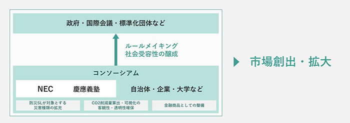 NECと慶應義塾は、脱炭素社会を実現するための気候変動対策となる今回の新たなアプローチ「潜在カーボンクレジット」の社会実装に向けて推進していきます。津波や洪水などの水害や、地震や森林火災などの自然災害への潜在カーボンクレジットの適用について検討を進めていくとともに、防災ソリューションの拡充やCO2抑制量の客観性・透明性を確保するための研究、そしてカーボンクレジット市場取引のための金融商品化の整備などを加速するため、業種・分野の枠を超えた企業や大学、政府、自治体などのパートナーとともに2023年度のコンソーシアムの設立を目指します。本コンソーシアムにおいては、早期に実証活動が実施可能な体制を構築し、各地の自治体とともに将来のCO2抑制量の検証を進め、金融商品の開発を推進していきます。
