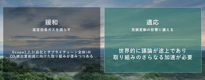 昨今、地球温暖化により水害や森林火災をはじめとする自然災害が激甚化・頻発化し、自然環境と社会経済の両面で日本のみならず世界中に大きな影響を与えています。自然災害においては森林火災などの発生時のCO2排出だけでなく、津波や洪水などによる被災後のインフラ・建築物の再建等でも大量のCO2が排出されており、世界でのCO2年間排出量約335億トンのうち10%以上がこれらの自然災害による影響とされています。(注*)こうした中、再生可能エネルギーの導入や省エネルギー対策によって地球温暖化の原因となる温室効果ガスの排出を削減・抑制する「緩和(Mitigation)」への対応だけでなく、気候変動の影響に備える「適応(Adaptation)」への対応も脱炭素社会に向けた取り組みとして重要となっています。