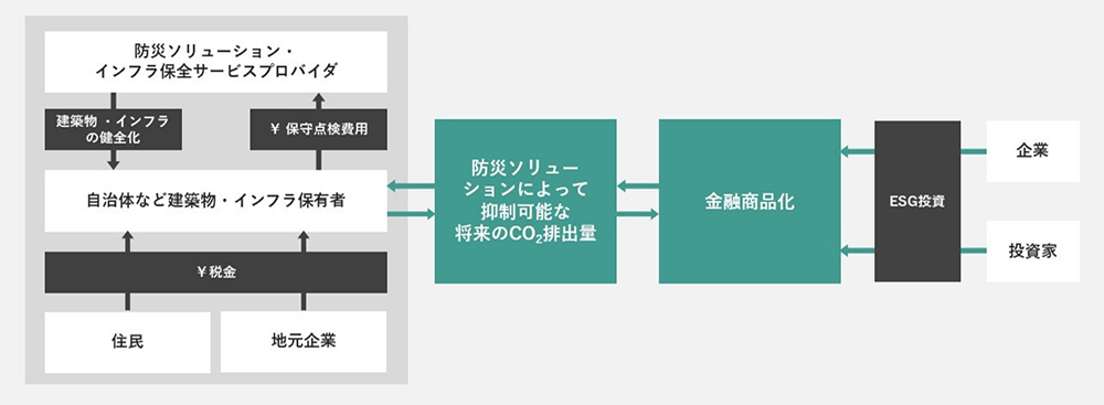 これらの算出・可視化したCO2抑制量に対して、インセンティブが働くようにファイナンスの仕組みで金融商品化する取り組みを進めていくことで、企業や政府、自治体などによる脱炭素に向けたESG投資と防災・減災対策を目的とした投資活性化を推進していきます。