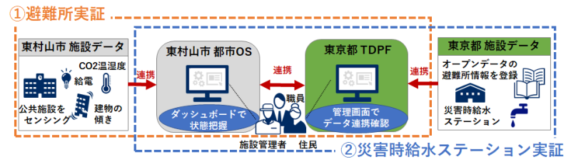 こうした中、本実証ではIoTセンサーにより自動で収集した被災状況等のデータを東村山市が実装する都市OS(FIWAREを活用)とTDPFに連携することで、関係機関へのスムーズなデータ連携の有効性を検証しました。