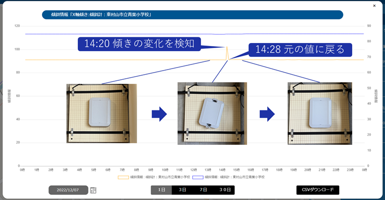 東村山市内の避難所(市立小学校3校)に設置した傾斜計を傾けたのち、元の位置に戻すことにより地震の揺れを模擬的に再現しました。その上で、被災状況を電流センサーやCO2/温湿度センサーで自動検知する実証を実施しました。